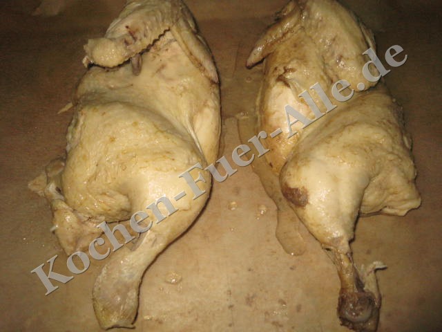 Junges Brathähnchen  in Topf mit Wasser ca. 20  Minuten kochen. Vorsichtig raus holen und mit Schere halbieren.
