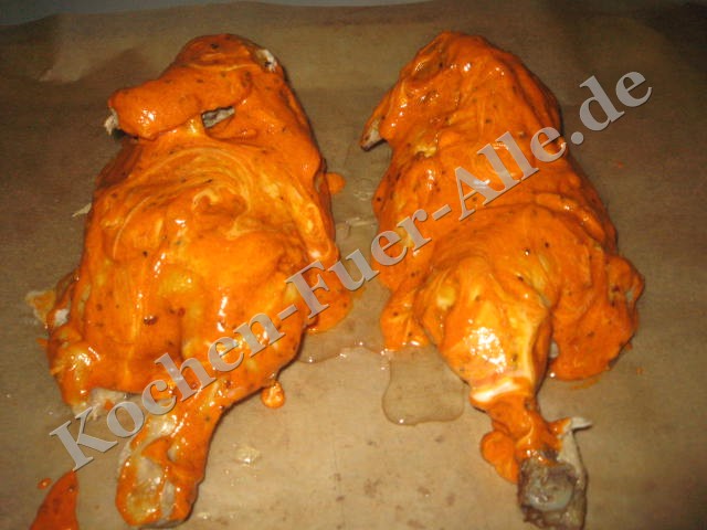 Sauce vorbereiten: Mayonnaise,  Tomaten Mark, Paprika edel süß, Salz, Pfeffer mischen und Hähnchen bestreichen.