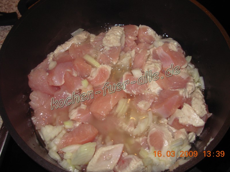 Fleisch waschen und würfeln. Zwiebel schälen und klein hacken. In der Aluguss-Topf Öl erhitzen, und Fleisch mit Zwiebel abbraten.