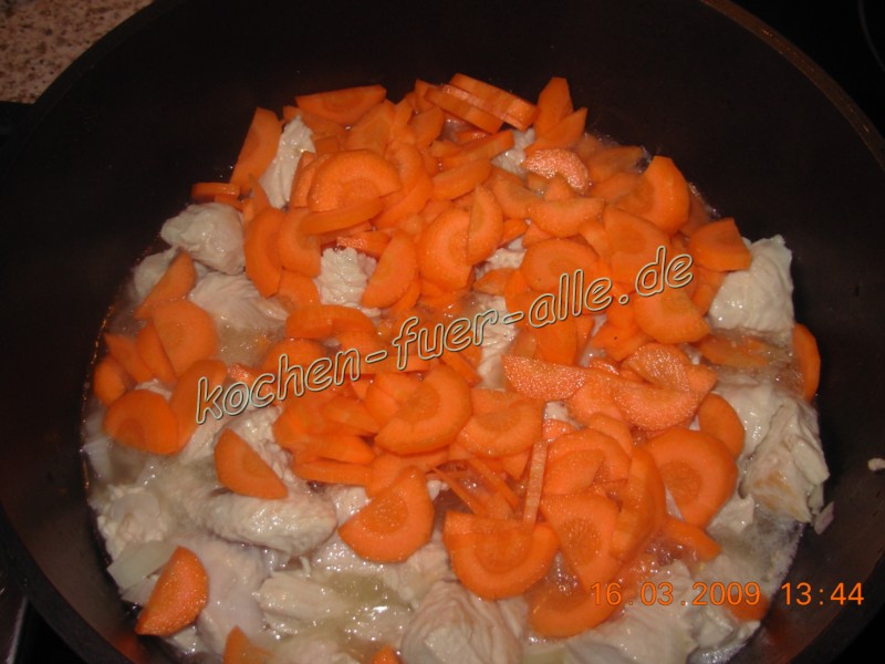 Karotten schälen, in Halbringe schneiden und dazu im Topf geben.