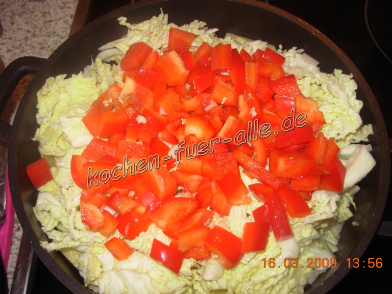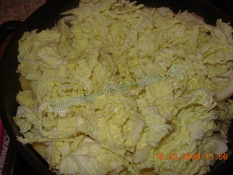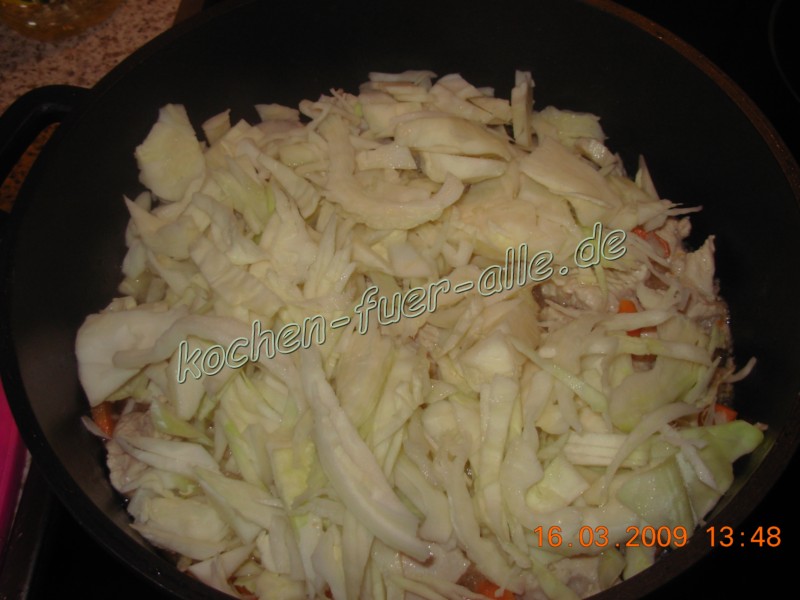 Weißkohl schneiden, im Topf geben und 5 Minuten schmoren.