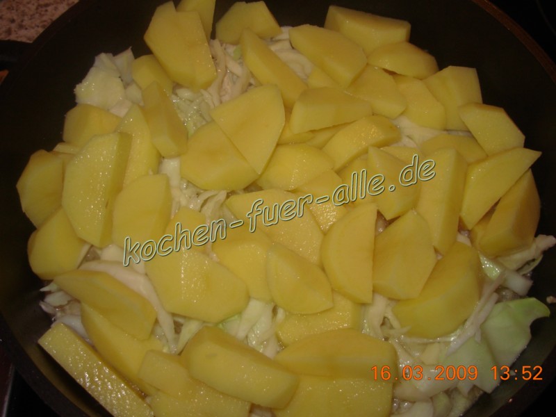 Kartoffel schälen, waschen und würfeln, im Topf geben und noch 5 Minuten schmoren lassen.