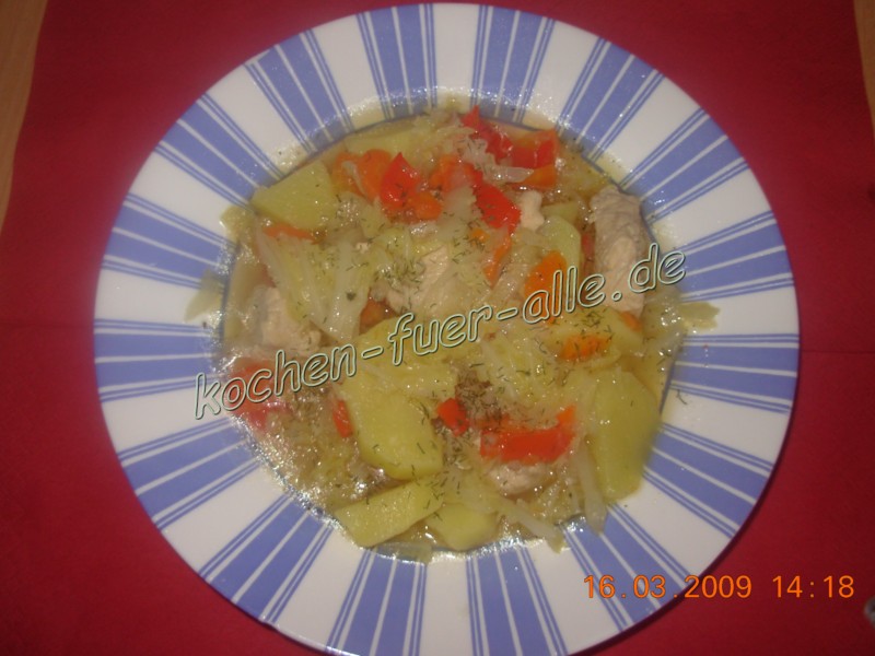 Fertige Speise mit Dill servieren.