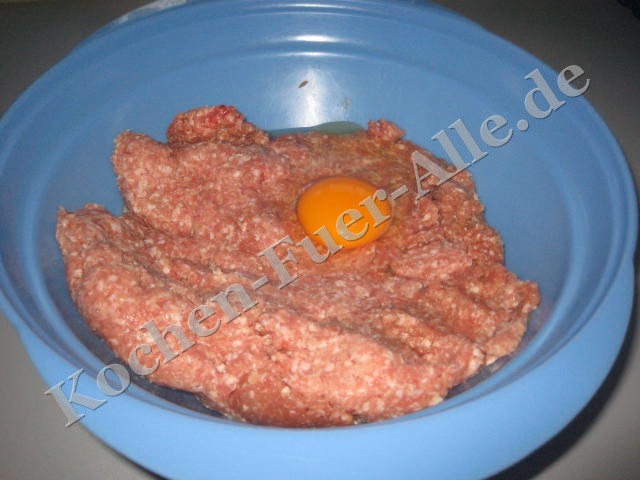 Mett vorbereiten mit Salz, Pfeffer würzen und Eier zugeben.