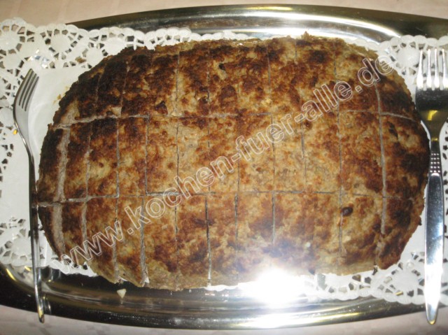 Blech mit Backpapier belegen. Fleisch Masse auf Blech legen und gut Formen. In Offen ca.45 Minuten backen bei 200 °C.