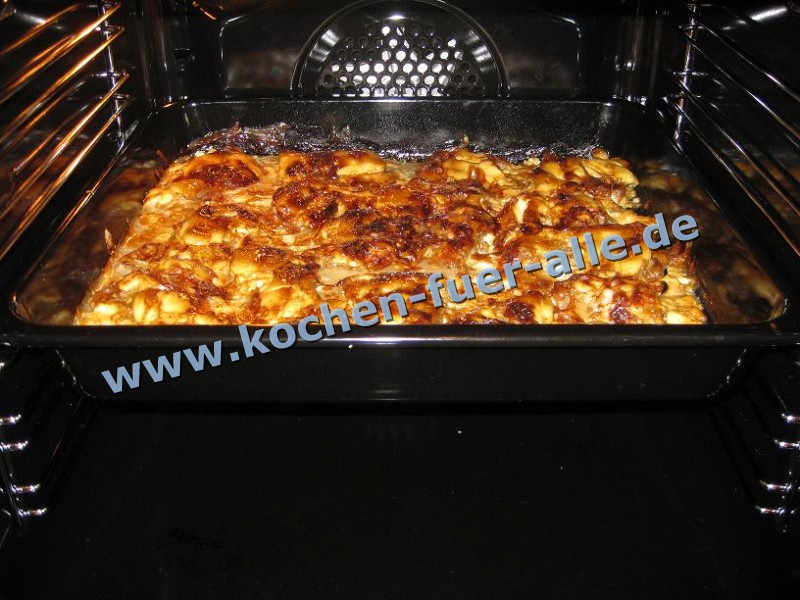Zwiebeln schälen, in Streifen schneiden und auf Fleisch drauf legen.