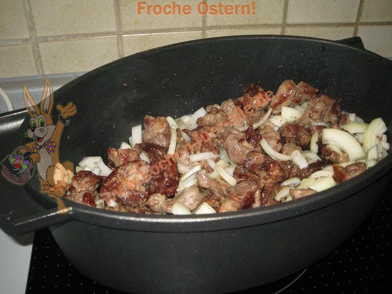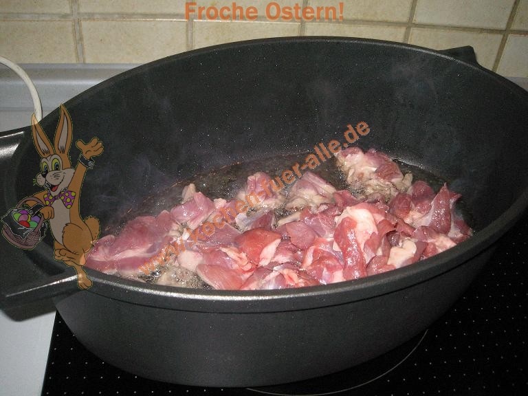 Fleisch in Würfel, Zwiebeln in Streifen schneiden. In Topf Öl erhitzen, Fleisch zugeben