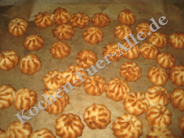Eiweiß zu einem steifem Schnee schlagen, Zucker unter rühren die Kokosflocken vorsichtig unterziehen.