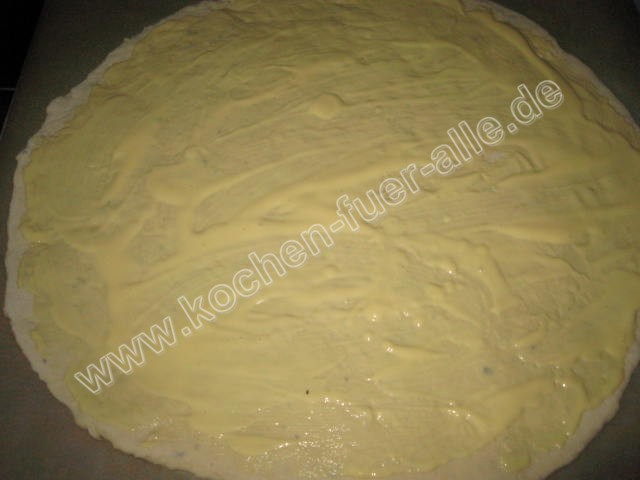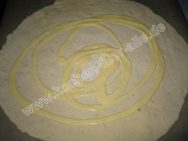 Quark Teig vorbereiten. In Schale Quark, Ei, Pizza Gewürzmischung, Salz, Backpulver rein geben. Gut herrühren und Mehl zugeben. Teig durchkneten und ausrollen.