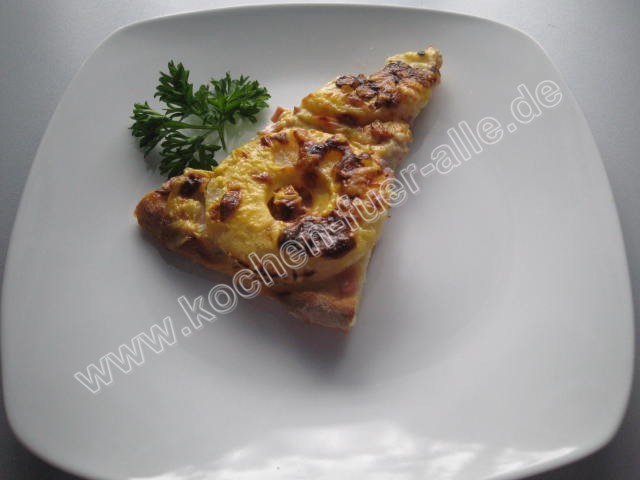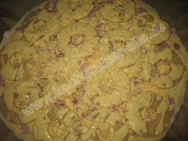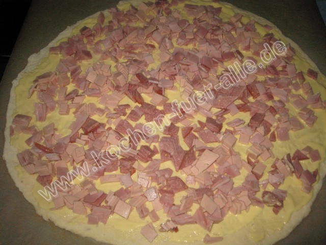 Schinken in kleine Würfel schneiden. Teig mit Schinken Würfel bestreuen.
