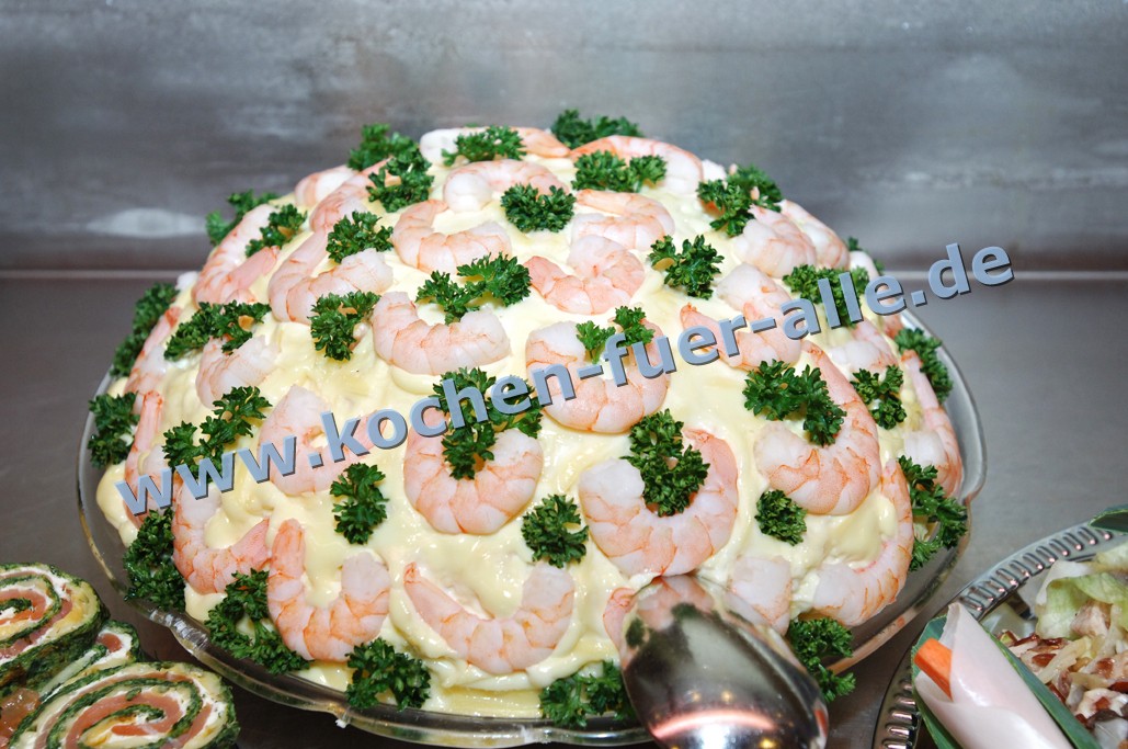 In Salat Teller als Berg formen, mit Mayonnaise bestreichen und mit Petersilie und Garnelen dekorieren.