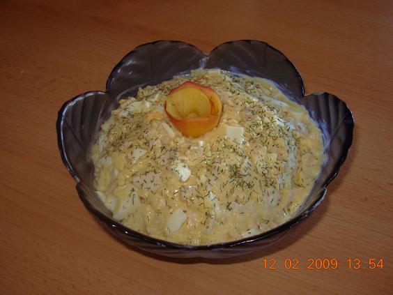 Hühnerbrustfilet waschen, im Topf kochen lassen. Eier kochen, pellen und klein würfeln. Äpfel schälen und grob reiben. In einer Salatschüssel alles vermischen,
