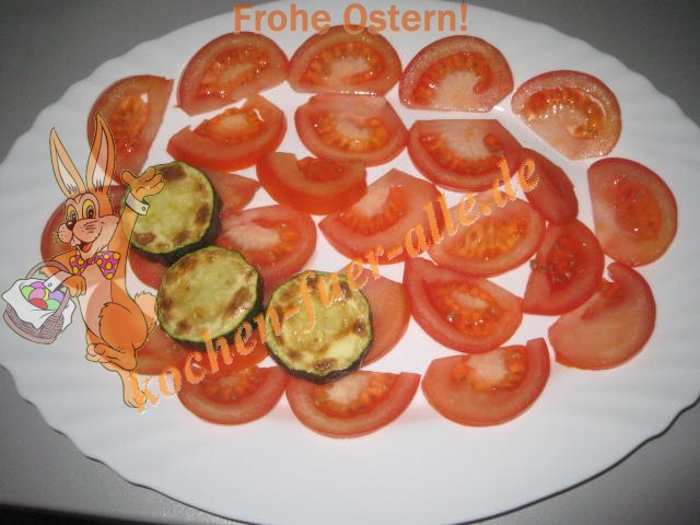 Zucchini in Scheiben schneiden, salzen und 10 Minuten stehen lassen. Tomaten halbieren und um halbe Scheiben schneiden, auf Teller legen.
