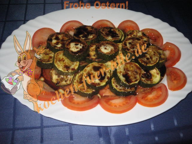 Zucchini im Öl beiderseitig braten und gleichmäßig auf Tomaten legen. In Schale Essig, Salz, Aceto Balsamico, Öl und Pfeffer mischen und auf Salat gießen.