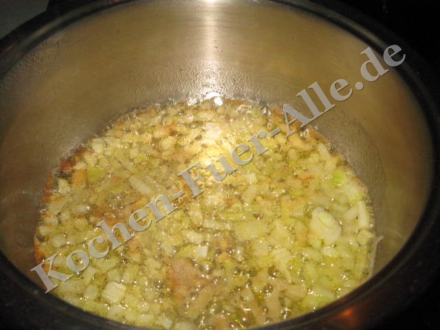 Zwiebeln in Topf kurz anrosten. Mit Mehl bestreuen.