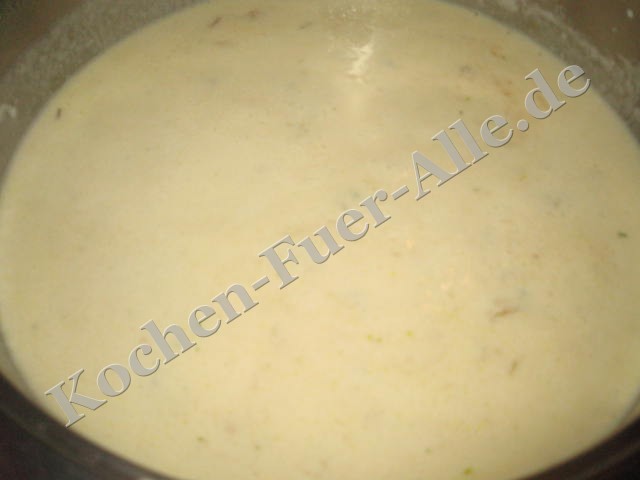 kurz schmoren, Sahne und Milch zugeben.
