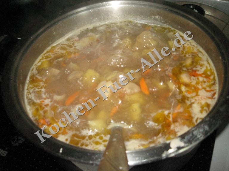 Kartoffeln und eine in Scheiben geschnittene Zwiebel in Brühe geben, aufkochen und Champignons zugeben.