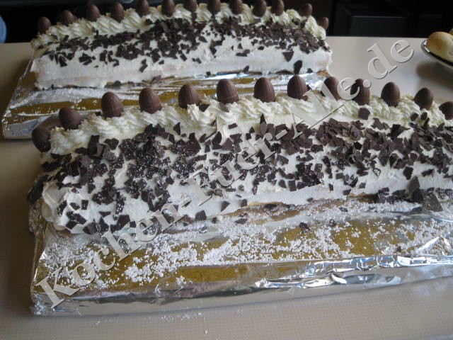 Mit Creme, Schoko Raspeln und Mocca Bohnen dekorieren.