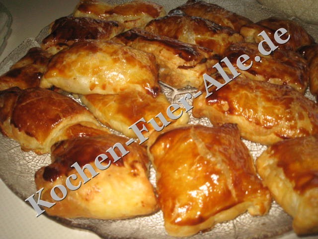 Blätterteig durchschneiden in 10cm große Vierecke, blanchierte Äpfeln würfeln in mitten legen mit Zucker bestreuen, Seiten mit Eigelb bestreichen und zukleben.