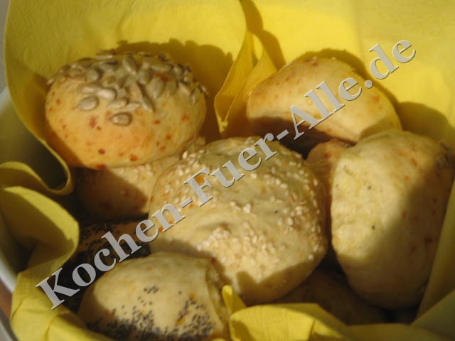Fertiges Teig in Brötchen formen. in Schale Eigelb und Sahne mischen, und Brötchen bepinseln. Dann bepinselte Brötchen mit Mohn, Sesam und gewünschte Körner bestreuen.