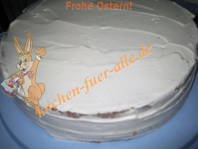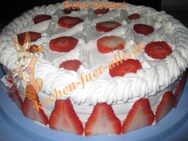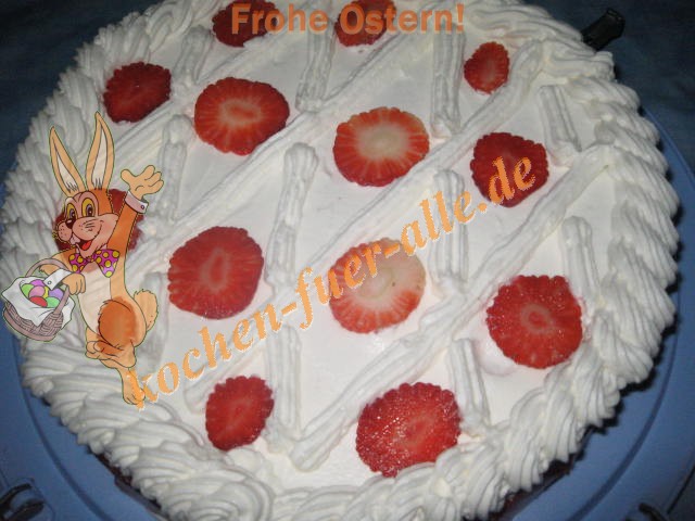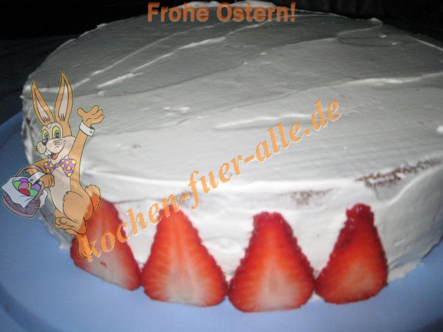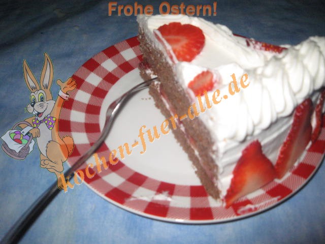 Biskuitmasse zubereiten in die Masse Kakao zu geben. In Runde Form ausbacken. Biskuit in 3 Schichten teilen. Erste Schicht mit Creme bestreichen und mit Erdbeere Scheiben belegen. Dann noch eine Schicht mit Teig. Wieder Creme und 3 Schicht Teig.