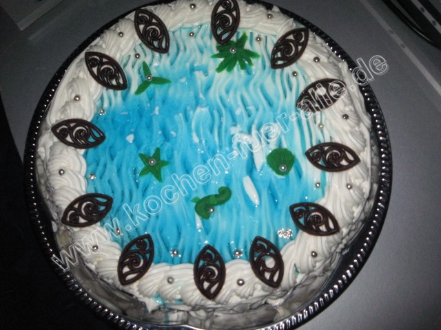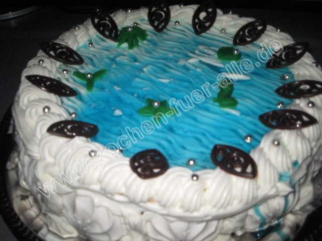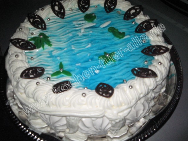 Curscao Blue in Kasserolle heiß machen. Weiche Gelatine zugeben. Abgekühlte Masse aber noch nicht Steife auf Torte Gießen. Aus Grüne Marzipan Figuren Basteln.