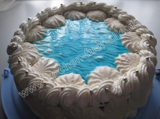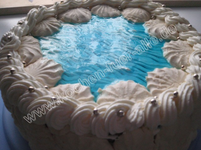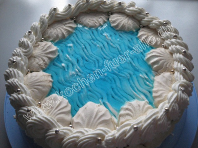 Gelatine im Kaltem Wasser einweichen. Curacao Blue aufwärmen und weiche Gelatine zugeben. Masse abkühlen und auf Torte gießen. Torte kalt stellen.