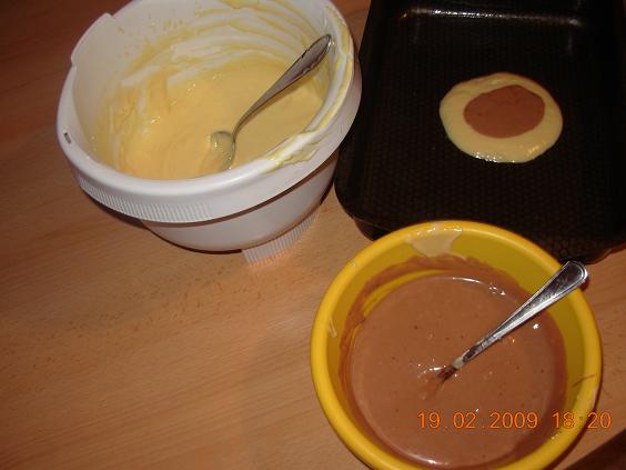 In der Mitte des Blech 1 EL Weiß Teig geben, oben 1EL Kakao Teig und wieder Weiß Teig und Kakao Teig